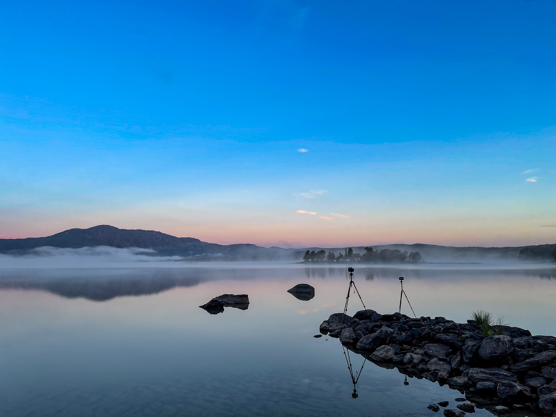 A calm lake with Ottsjötoppen rising in the background. Mornings often bring fog over the water, while evenings glow with sunset light. From the small forest road you can park and walk along the sandy shore to photograph mountains, islands, and the boats moored nearby.